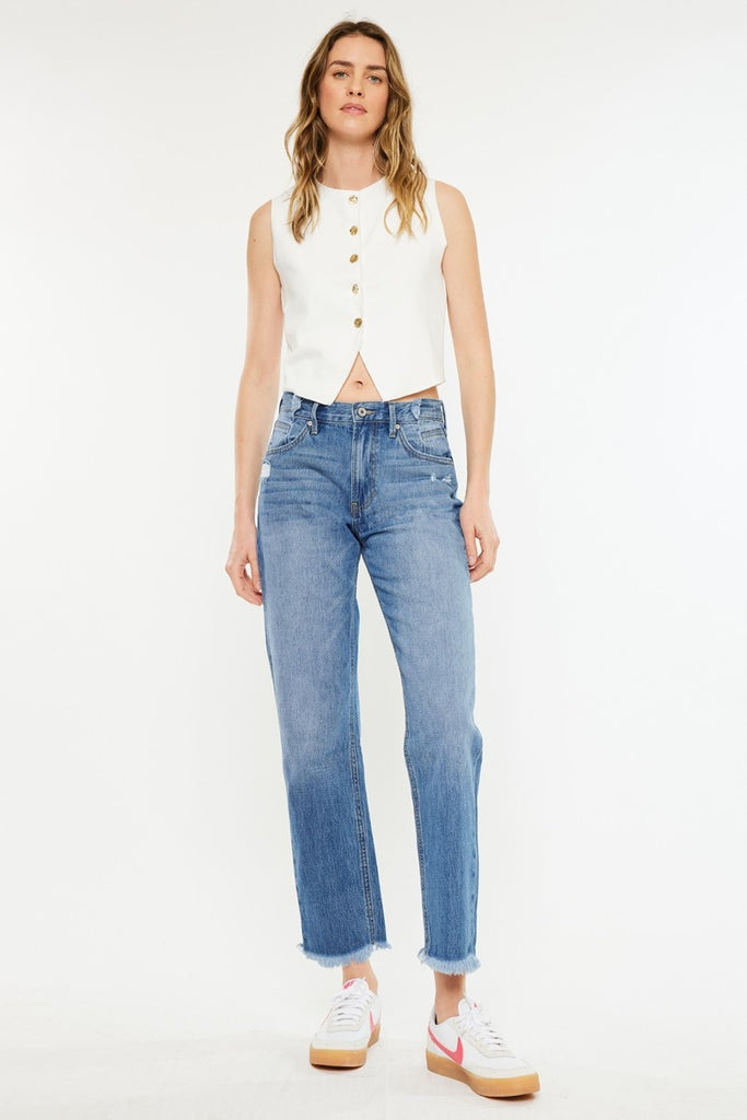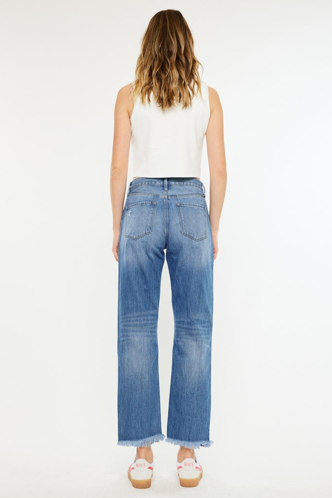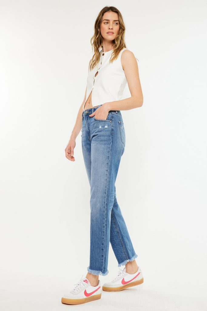 HIGH RISE STRAIGHT JEANS MEDIUM WASH UNEVEN WAISTBAND W/ CUT SEAM UNEVEN STEP HEM RISE 11" INSEAM 28" IN SIZE 5/26 100% COTTON